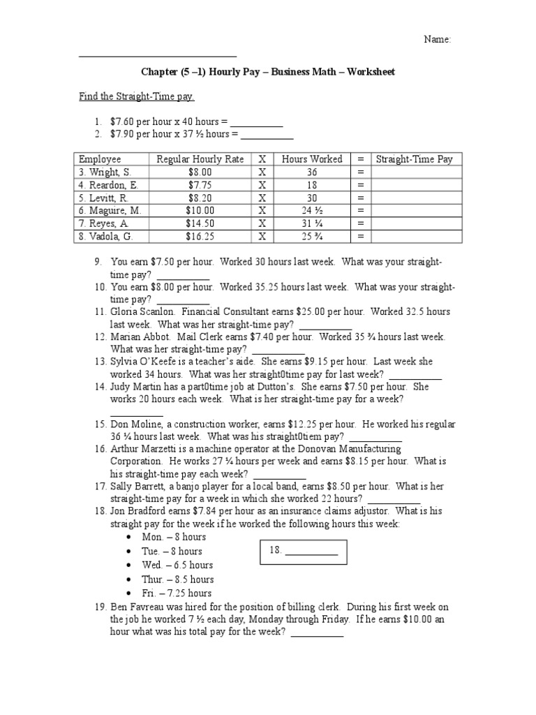 Chapter 5 1 Hourly Pay Business Math Worksheet Math Worksheet Math Chapter